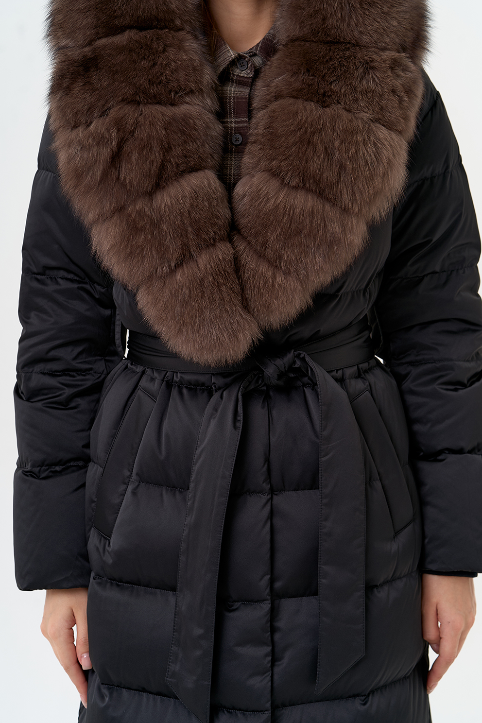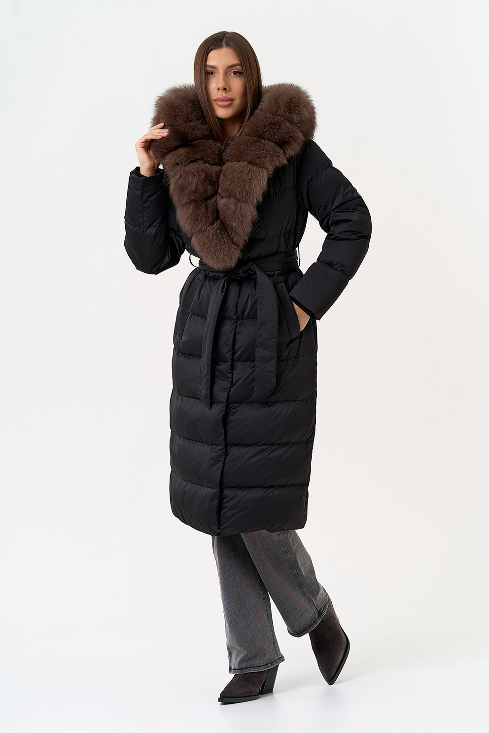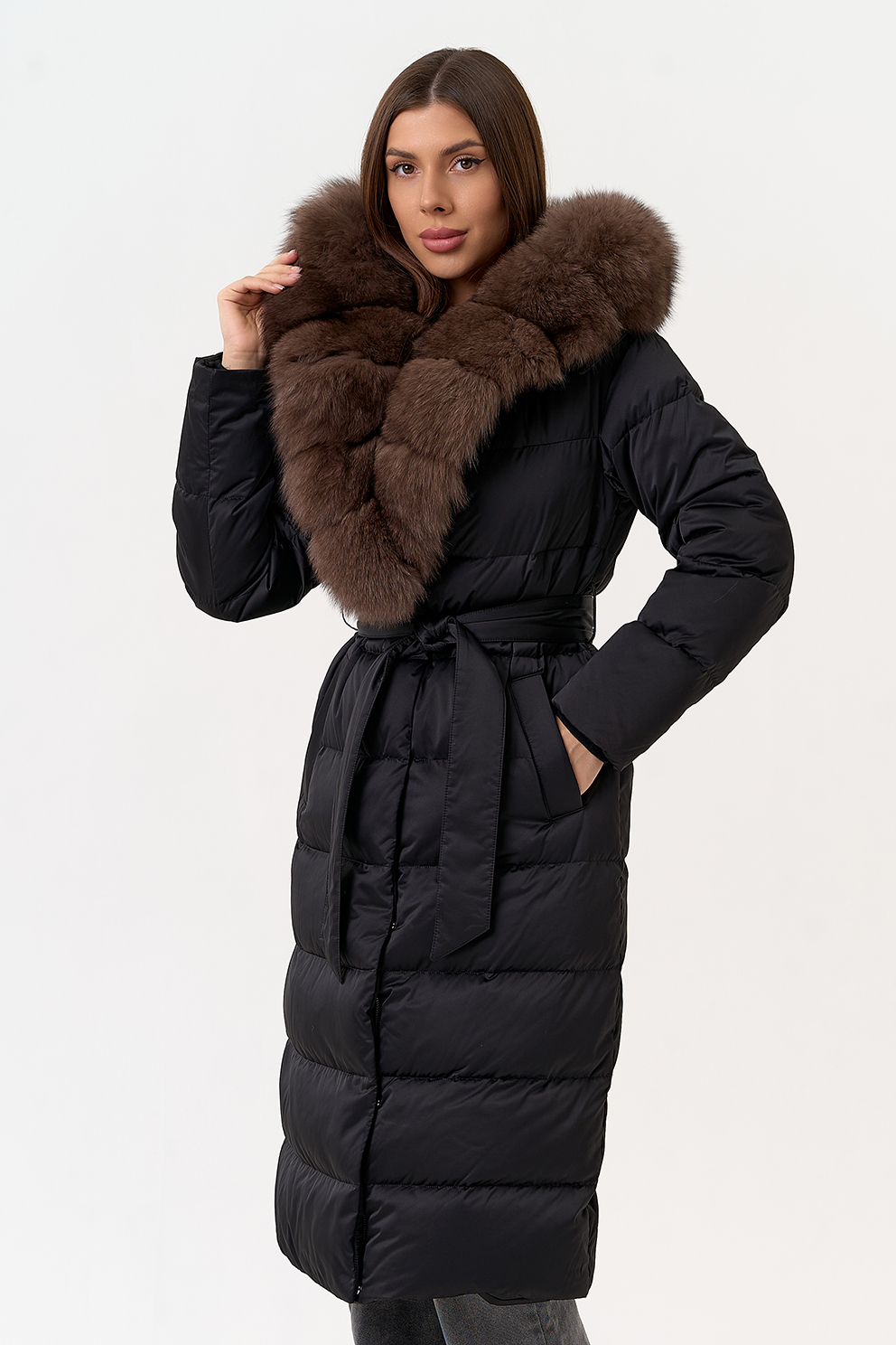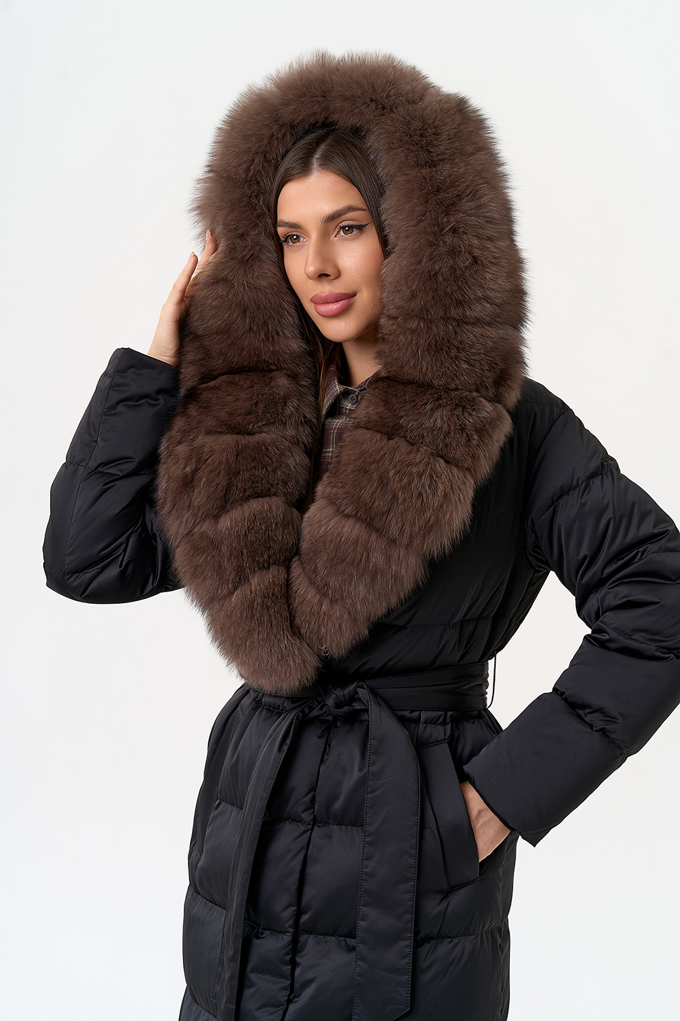 Крой воротника - капюшон, отделка мех песца