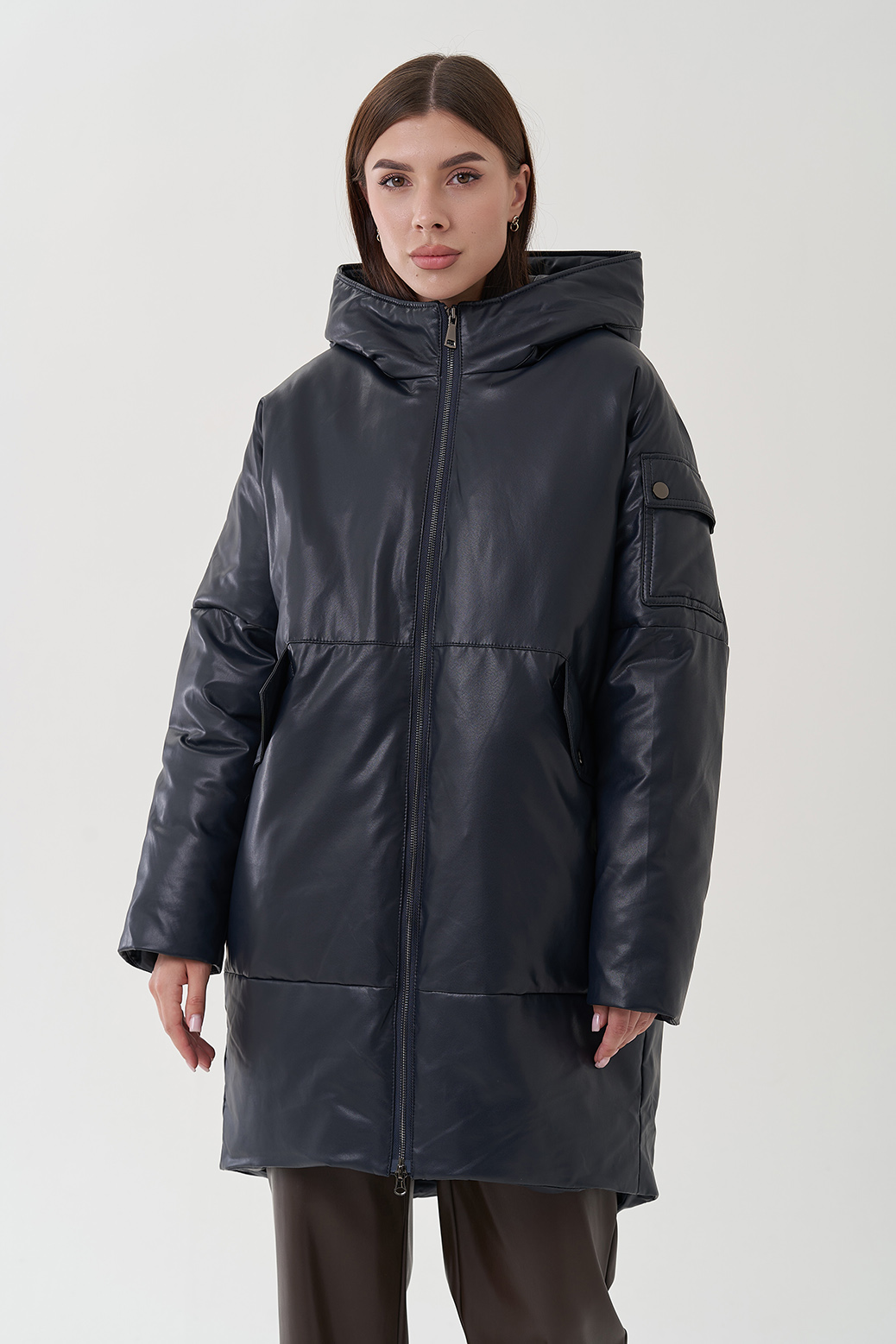 Женский пуховик из эко кожи коричневого цвета