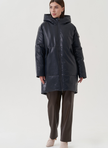Женский пуховик синего цвета из эко кожи (чёрный, синий)